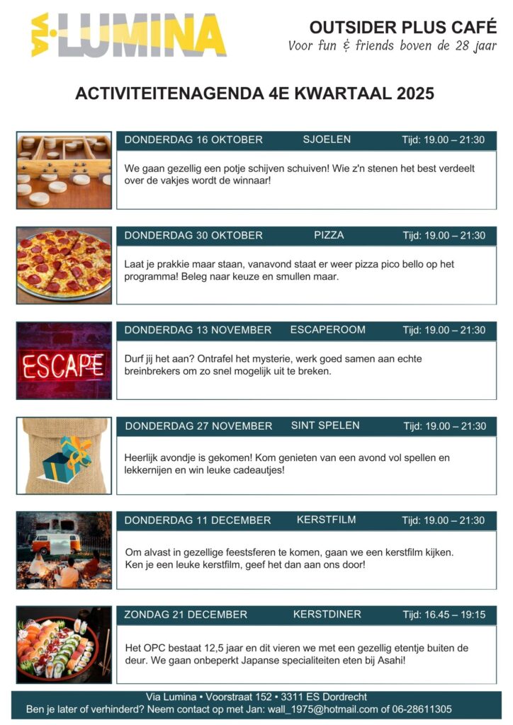 Bezoekers van het Outsider Pluscafé ondernemen met elkaar gezellige activiteiten in en rond Dordrecht. Soms bezoekt het OPC Dordtse evenementen, een concert of ze gaan met elkaar naar de film. Een andere keer gaan de bezoekers lekker met elkaar uit eten of ze blijven in de galerie om spelletjes te doen. Ook karaoke is een populaire activiteit in het OPC.
